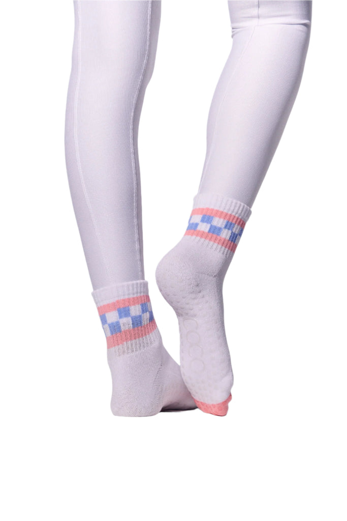 The best barre and pilates grip socks. This COCO Sock has all the features of a favorite grip sock with its cushioning soft feel and detailed with a classic stripe. With its versatile wear of scrunched or tall, you can wear it with leggings or shorts.