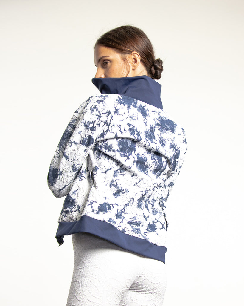 Our Laguna Jacket is made in our jacquard signature fabric. With its fun textured print and navy lycra detail, this jacket adds the ultimate up leveling touch to any fitness outfit.